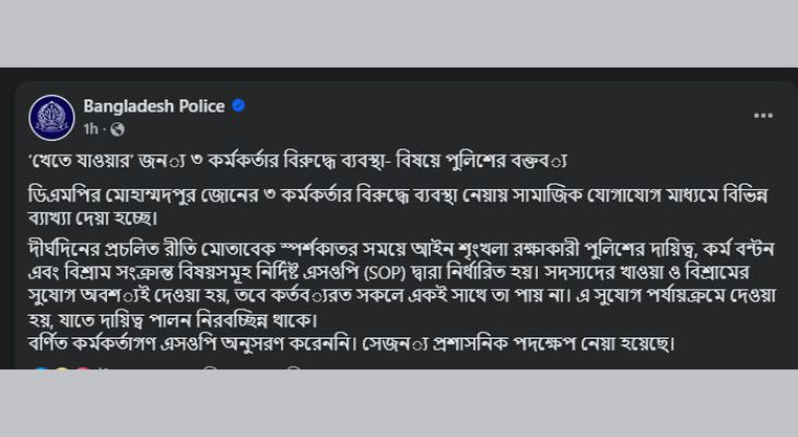 শনিবার (২০ সেপ্টেম্বর) বাংলাদেশ পুলিশের ফেসবুক পেজে এক পোস্টের মাধ্যমে বলা হয়, দীর্ঘদিনের প্রচলিত রীতি মোতাবেক স্পর্শকাতর সময়ে আইনশৃঙ্খলা রক্ষাকারী পুলিশের দায়িত্ব, কর্ম বণ্টন এবং বিশ্রাম সংক্রান্ত বিষয়সমূহ নির্দিষ্ট স্টেটমেন্ট অব পারপাস (এসওপি) দ্বারা নির্ধারিত হয়। সদস্যদের খাওয়া ও বিশ্রামের সুযোগ অবশ্যই দেওয়া হয়, তবে কর্তব্যরত সবাই একইসঙ্গে তা পায় না। এ সুযোগ পর্যায়ক্রমে দেওয়া হয়, যাতে দায়িত্ব পালন নিরবচ্ছিন্ন থাকে। বর্ণিত কর্মকর্তারা এসওপি অনুসরণ করেননি। সেজন্য প্রশাসনিক পদক্ষেপ নেওয়া হয়েছে।