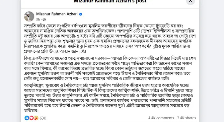 তিনি লেখেন, সম্প্রতি ফাঁদে ফেলে সংগঠিত ধর্ষণগুলো মুসলিম তরুণীদের জীবনের নিছক কোনো ট্র্যাজেডি নয় বরং আমাদের সামগ্রিক নৈতিক অবক্ষয়ের এক অশনিসংকেত। পাশাপাশি এটি দেশের স্থিতিশীলতা ও সাম্প্রদায়িক সম্প্রীতি নষ্ট করার এক অপচেষ্টা-ও বটে। যদি এটি কোনো অপশক্তির ষড়যন্ত্র হয়ে থাকে, তাহলে তা গোটা দেশ ও জাতির নিরাপত্তা এবং শৃঙ্খলার জন্য চরম এক হুমকি।
