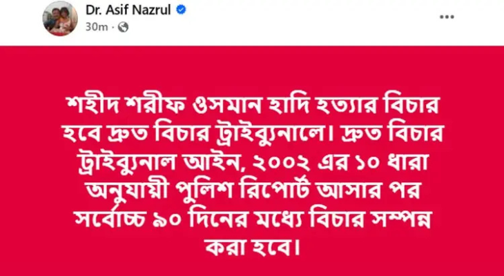 আসিফ নজরুল পোস্টে লেখেন, শহিদ শরীফ ওসমান হাদি হত্যার বিচার হবে দ্রুত বিচার ট্রাইব্যুনালে। দ্রুত বিচার ট্রাইব্যুনাল আইন, ২০০২ এর ১০ ধারা অনুযায়ী পুলিশ রিপোর্ট আসার পর সর্বোচ্চ ৯০ দিনের মধ্যে বিচার সম্পন্ন করা হবে।