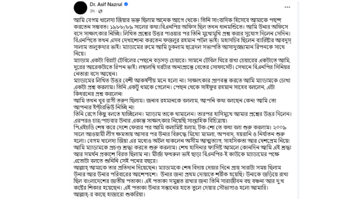 আসিফ নজরুল লেখেন, আমি বেগম খালেদা জিয়ার ভক্ত ছিলাম অনেক আগে থেকে। তিনি সাংবাদিক হিসেবে আমাকে পছন্দ করতেন সম্ভবত। ১৯৮৮/৮৯ সালের কথা, বিএনপির অফিস ছিল তখন ধানমন্ডিতে। আমি উনার অফিসে বসে সাক্ষাৎকার নিচ্ছি। লিখিত প্রশ্নের উত্তর পাওয়ার পর তিনি মুখোমুখি প্রশ্ন করার সুযোগ দিলেন সে দিন।