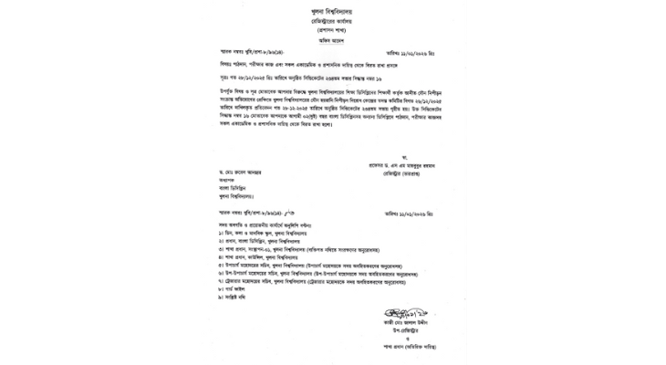 ছাত্রীকে যৌন নিপীড়নের অভিযোগে খুলনা বিশ্ববিদ্যালয়ের বাংলা ডিসিপ্লিনের অধ্যাপক ড. মো. রুবেল আনছারকে দুই বছরের জন্য সকল একাডেমিক ও প্রশাসনিক দায়িত্ব থেকে বিরত রাখার নির্দেশ দিয়েছে বিশ্ববিদ্যালয় প্রশাসন। রোববার (১১ জানুয়ারি) বিশ্ববিদ্যালয়ের ভারপ্রাপ্ত রেজিস্ট্রার অধ্যাপক ড. এস এম মাহবুবুর রহমান এক চিঠিতে এ তথ্য জানান।