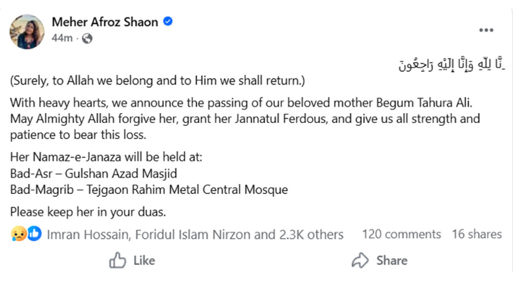পোস্টে তিনি লেখেন, ‘গভীর শোকের সঙ্গে জানাচ্ছি যে আমাদের প্রিয় মা বেগম তাহুরা আলী ইন্তেকাল করেছেন। পরম করুণাময় আল্লাহ তাআলা যেন তাকে মাফ করে দেন। ‘জান্নাতুল ফেরদাউস দান করেন এবং এই শোক সহ্য করার তৌফিক ও ধৈর্য আমাদের সবাইকে দান করেন।’