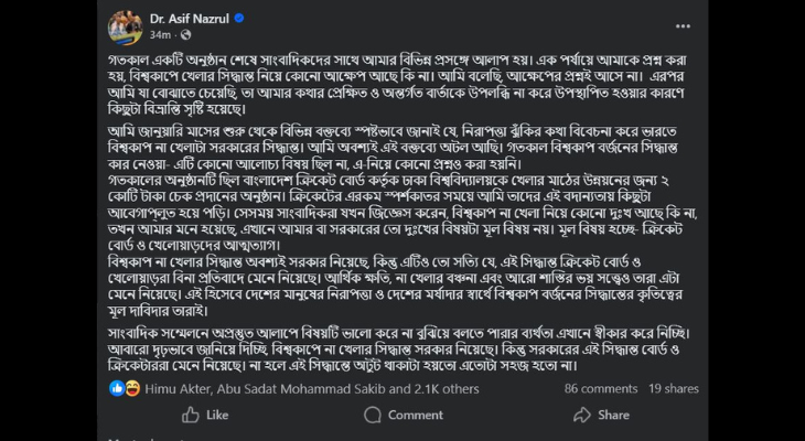 আসিফ নজরুল তার পোস্টে লেখেন, ‘‘গতকাল একটি অনুষ্ঠান শেষে সাংবাদিকদের সাথে আমার বিভিন্ন প্রসঙ্গে আলাপ হয়। এক পর্যায়ে আমাকে প্রশ্ন করা হয়, বিশ্বকাপে খেলার সিদ্ধান্ত নিয়ে কোনো আক্ষেপ আছে কি না। আমি বলেছি, আক্ষেপের প্রশ্নই আসে না। এরপর আমি যা বোঝাতে চেয়েছি, তা আমার কথার প্রেক্ষিত ও অন্তর্গত বার্তাকে উপলব্ধি না করে উপস্থাপিত হওয়ার কারণে কিছুটা বিভ্রান্তি সৃষ্টি হয়েছে।’’