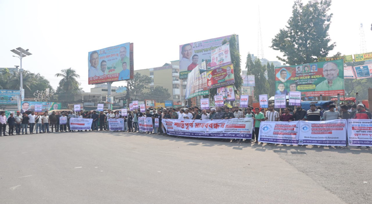 সোমবার (২৪ নভেম্বর) সকাল থেকে দোকান বন্ধ রেখে মহানগরীর প্রাণকেন্দ্র শিববাড়ির মোড়ে খুলনা মহানগর মোবাইল ফোন ও অ্যাক্সেসরিজ ব্যবসায়ী মালিক সমিতির উদ্যোগে মানববন্ধন করেন তারা।