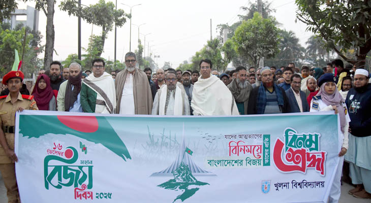 যথাযথ মর্যাদা ও ভাবগাম্ভীর্যের মধ্য দিয়ে বিপুল উৎসাহ উদ্দীপনায় আজ ১৬ ডিসেম্বর (মঙ্গলবার) খুলনা বিশ্ববিদ্যালয়ে মহান বিজয় দিবস উদযাপিত হয়েছে। দিবসটি উপলক্ষ্যে সকাল সাড়ে ৬টায় বিশ্ববিদ্যালয়ের প্রশাসনিক ভবনের সম্মুখে জাতীয় পতাকা উত্তোলন করা হয়। এরপর প্রশাসনিক ভবনের সামনে থেকে একটি শোভাযাত্রা বের হয়ে শহিদ মিনারে গিয়ে শেষ হয়।