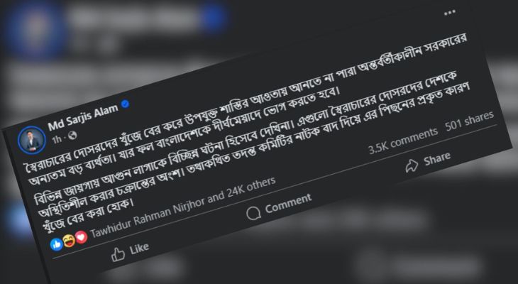 তিনি আরও লেখেন, বিভিন্ন জায়গায় আগুন লাগাকে বিচ্ছিন্ন ঘটনা হিসেবে দেখি না। এগুলো স্বৈরাচারের দোসরদের দেশকে অস্থিতিশীল করার চক্রান্তের অংশ। তথাকথিত তদন্ত কমিটির নাটক বাদ দিয়ে এর পিছনের প্রকৃত কারণ খুঁজে বের করা হোক।