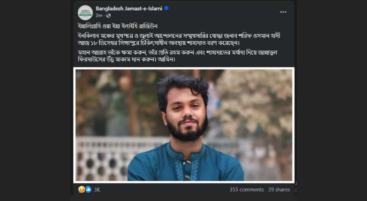 এর আগে ওসমান হাদির ভেরিফায়েড ফেসবুক পেজ ও ইনকিলাব মঞ্চের ফেসবুক পেজে তার মৃত্যুর বিষয়টি নিশ্চিত করে পোস্ট দেয়া হয়।