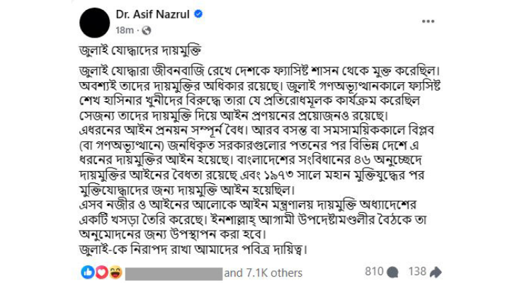 পোস্টে তিনি আরও লিখেছেন, ‘এ ধরনের আইন প্রণয়ন সম্পূর্ণ বৈধ। আরব বসন্ত বা সমসাময়িককালে বিপ্লব (বা গণঅভ্যুত্থানে) জনধিকৃত সরকারগুলোর পতনের পর বিভিন্ন দেশে এ ধরনের দায়মুক্তির আইন হয়েছে। বাংলাদেশের সংবিধানের ৪৬ অনুচ্ছেদে দায়মুক্তির আইনের বৈধতা রয়েছে এবং ১৯৭৩ সালে মহান মুক্তিযুদ্ধের পর মুক্তিযোদ্ধাদের জন্য দায়মুক্তি আইন হয়েছিল।’