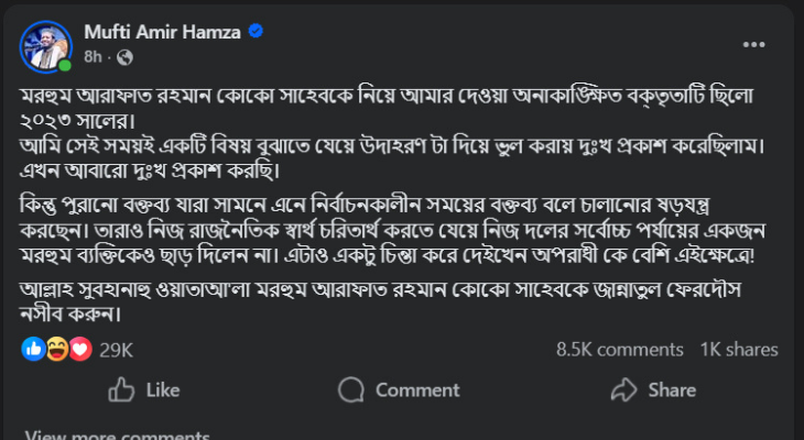 ইসলামী বক্তা ও কুষ্টিয়া-৩ আসনে জামায়াতে ইসলামী মনোনীত প্রার্থী মুফতি আমির হামজা বিএনপি প্রতিষ্ঠাতা জিয়াউর রহমান ও সাবেক প্রধানমন্ত্রী বেগম খালেদা জিয়ার ছোট ছেলে মরহুম আরাফাত রহমান কোকোকে নিয়ে দেয়া বক্তব্যের জন্য আবারও দুঃখ প্রকাশ করেছেন। শুক্রবার (১৬ জানুয়ারি) দিবাগত রাতে নিজের ভেরিফায়েড ফেসবুক পেজে দেয়া এক পোস্টে তিনি জানান, আলোচিত ওই বক্তব্যটি সাম্প্রতিক নয়; এটি ২০২৩ সালের। সে সময়েই তিনি বিষয়টি নিয়ে অনুতাপ প্রকাশ করেছিলেন। এখন আবারও তিনি ওই বক্তব্যের জন্য দুঃখ প্রকাশ করছেন।
