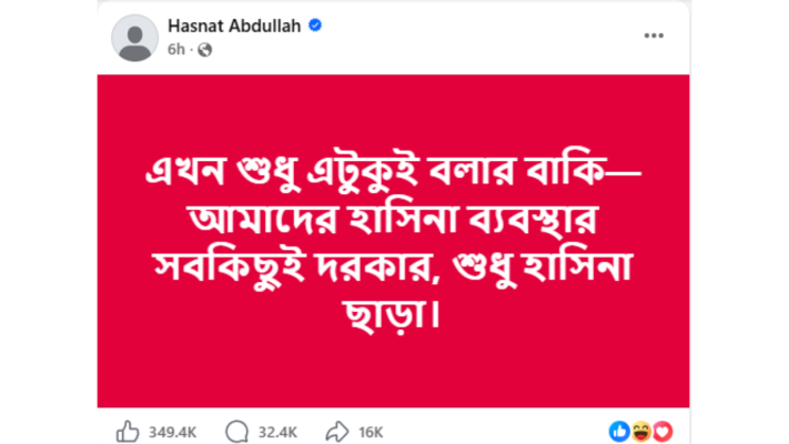 হাসনাত আবদুল্লাহ লিখেছেন, ‘এখন শুধু এটুকুই বলার বাকি— আমাদের হাসিনা ব্যবস্থার সবকিছুই দরকার, শুধু হাসিনা ছাড়া।’